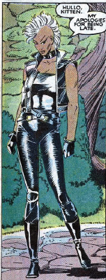 I don't know who it was, but somebody came up with the brilliant idea of taking away Storm's powers. In the storyline, Forge accidentally shoots her with a gun he's been working on that will take away mutant powers. Storm has already been struggling with her rebellious nature. Prior to losing her powers while in Japan, a ninja reminds her of the girl that she used to be. Storm ends up getting a Mohawk and sporting lots of leather which causes a rift between her and Kitty.